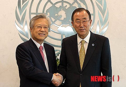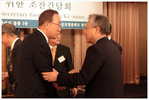 KT 이석채 회장이 자발적 기업 시민 이니셔티브인 유엔글로벌콤팩트 한국협회가 26일 주최한 반기문 유엔사무총장과의 조찬간담회에서 반 총장과 반갑게 인사를 나눴다. 이날 반기문 총장은 기업의 사회적 책임과 지속가능성을 추구하는 경영문화를 강조했다.