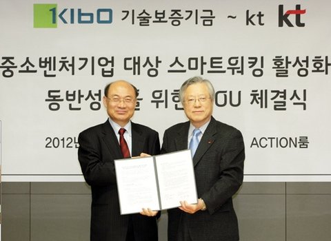 KT(회장 이석채)와 기술보증기금(이사장 김정국)은 6일 서울시 서초구 서초동 KT 올레캠퍼스에서 중소기업과의 동반성장을 위한 스마트워킹 활성화 지원 협약을 체결했다.