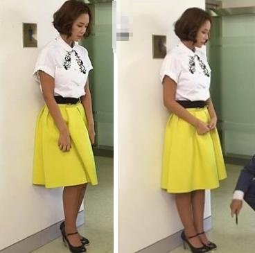 심플한 블라우스에 화사한 노란 럭키슈에뜨치마로