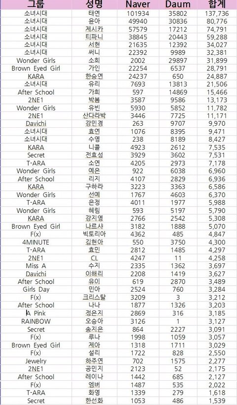이게 맞음.네이트판에서 좋아한다고 그때 정은지 원탑이라는 글보고..정은지 안티는 아니지만 보고 좀 이상하다싶어 나도 찾아봣음.정은지는 아직 원탑은 아닌듯..그래도 뭐 나중엔 될수도 있겟지만 일단 현재는 이셋이 탑.