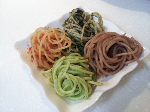 실험정신으로.. 맛이 없을때를 대비해 한젓가락씩만 만들어본 4색 파스타인데, 보라색만 맛이 조금 끔찍했고 다른건 괜찮았어요. 뭐가 들어갔을까요~?
