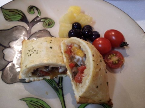 안에는 볶은 소고기와 야채, 방울토마토 치즈등과 칠리소스가 들어있어요!