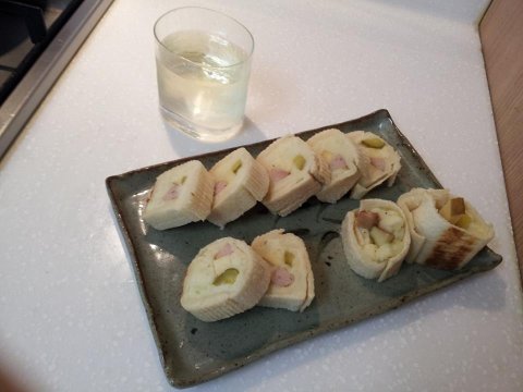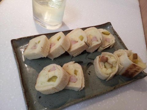 보통 '롤샌드위치'라고 하면 식빵에 슬라이스 치즈, 슬라이스 햄정도 넣고 돌돌 말잖아요. 좀더 김밥에 가까운 형태의 샌드위치를 만들어봤어요. 안에 하얀건~ 제 사랑 매쉬드 포테이토고요, 피클, 소시지, 사과가 들어갔어요^^
