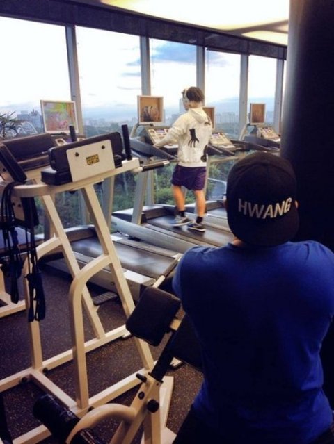 공개된 사진에는 태양이 후드집업과 반바지 차림으로 런닝머신 위에서 운동을 열심히 하고 있다. 그 뒤에는 황싸부로 보이는 'HWANG'이라는 이니셜이 적힌 모자를 쓴 남성이 태양의 운동하는 모습을 지켜보고 있다.