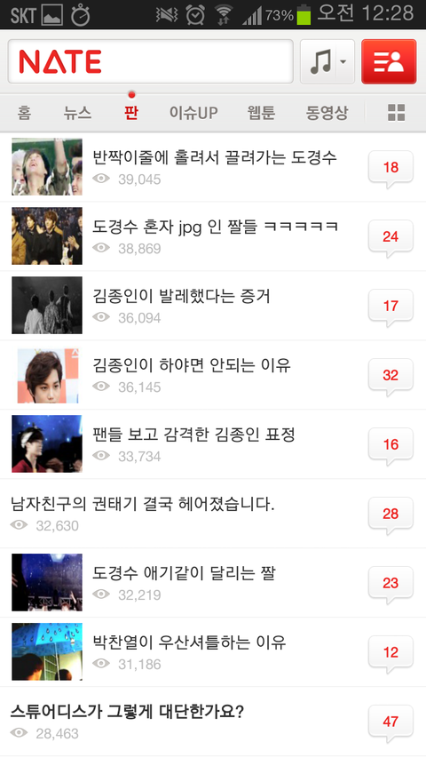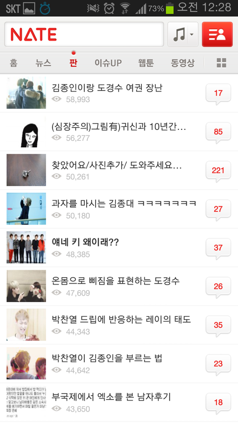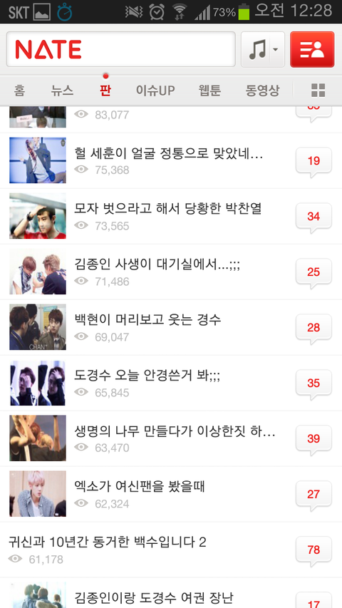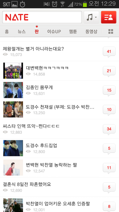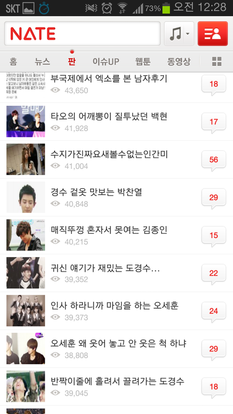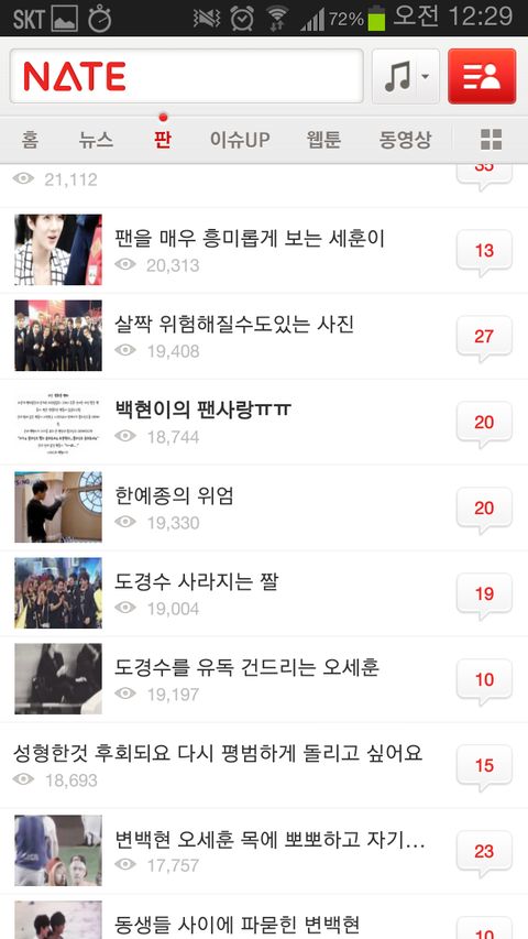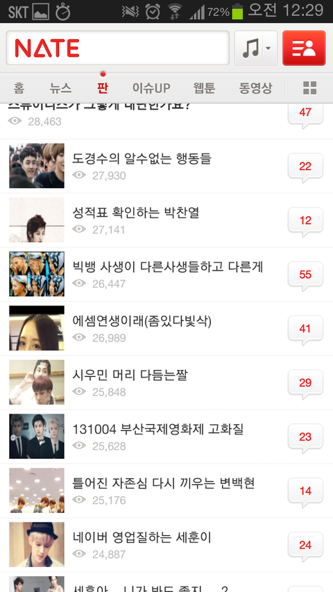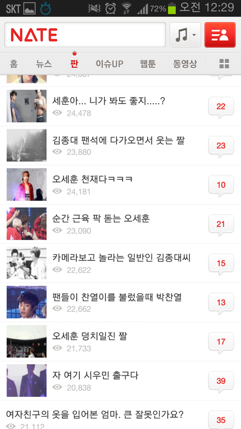 하루일과 마치고 사람들사는 얘기나 읽으면서 훈훈하게 마무리 할려는데 니네 가수 때문에 솔직히 진짜 화날 것 같다. 나만 그럴 것 같냐? 그만 좀 해라. 팬카페가서 놀라고. 팬 카페에서 이러면 누가 뭐라디? 좀 제발 좀 가라. 엑소 귀엽게 생각하고 있었는데 진짜 진심으로 팬들아 니네때문에 싫어질 것 같어ㅡㅡ