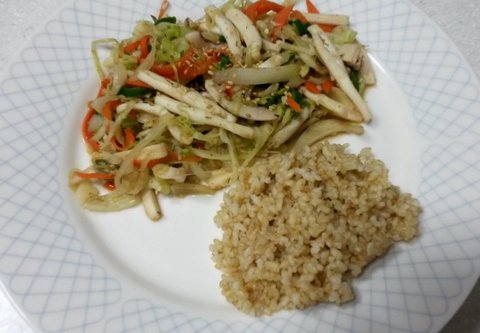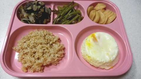 <아침- 현미밥100g, 계란찜, 저염버섯볶음, 저염고구마줄기볶음, 총각김치>