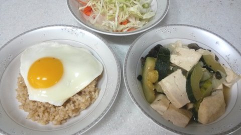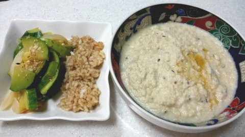 <아침- 현미밥50g, 호박새우젓볶음, 비지찌개>