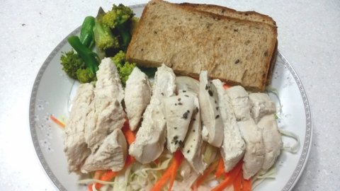 <저녁- 호밀식빵 1쪽, 닭가슴살 1쪽, 생야채>
