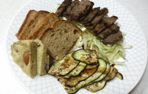 <저녁- 호밀식빵1조각, 고구마빵 1/8, 채끝살80g, 구운가지, 생야채>