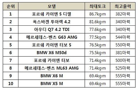 국내서 판매되고 있는 SUV 중 최대토크가 가장 높은 SUV TOP10 이라고 합니다.