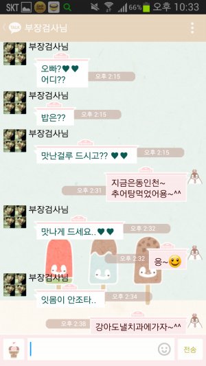 엄마가 '돈 많이 벌어와'라는 암시를 뜻하는 돈모양 이모티콘을 보내자 아빠는 세가지 이모티콘을 보내심. 그중 세번째 헤롱 이모티콘을 보고 엄마가 무슨 뜻인지 물어봄. 아빠가 돈을 많이 벌겠다고 다짐하자 엄마는 다시 튕기며 아직 부족하다고 애교를 부림.; 거기에 우리아빠는 맞애교로 대응함.ㅋㅋㅋㅋㅋㅋㅋ