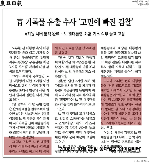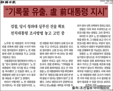 <검찰은 2008년 10월, 노무현 전 대통령이 국가기록원에 반납하지 않고, 추가로 유출한 자료나 더 복제돼 나간 자료는 없다고 발표했다.>