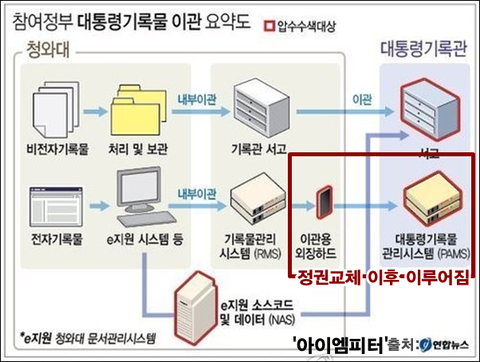 참여정부에서 생산된 대통령 기록물의 문서는 기록관 서고로 직접 옮겨지는 데 반해, 전자기록물은 <청와대 이지원>을 기초로 기록물관리시스템을 거쳐 이관용 외장 하드에 기록을 옮깁니다. 참여정부는 이관용 외장하드를 국가기록원에 이관했습니다.