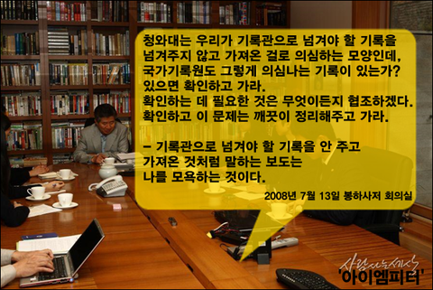 2008년 7월 13일 오전 11시 45분 봉하 사저를 방문한 국가기록원 관계자에게 노무현 대통령은 <의심나는 기록이 있으면 확인하고 가고, 확인하는 데 필요한 것은 무엇이든지 협조하겠다. 확인하고 이 문제는 깨끗이 정리해주고 가라>고 말했습니다.