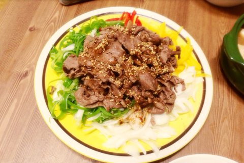 파 양파 파프리카 채에 고기올리시고 간장드레싱 와 함께 드시면 됩니다~