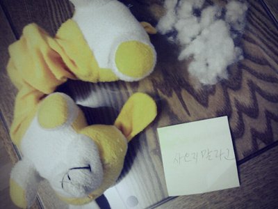나의 퇴근시간에 맞춰 솜을토해내는 인형과 메모를 식탁위에 ...........................