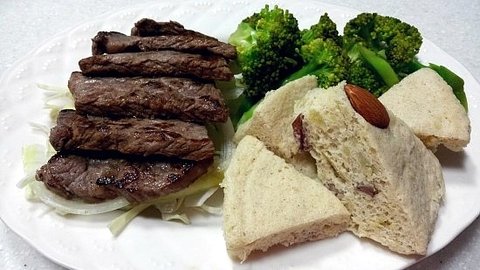 <운동전 저녁메뉴- 소고기(채끝살)120g, 고구마빵, 생야채>