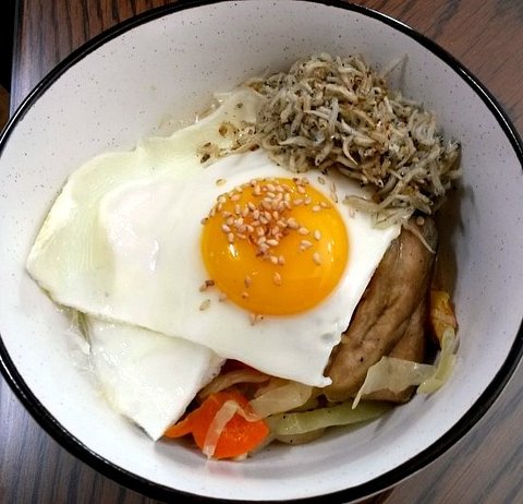 아침메뉴로 야채볶음에 계란후라이 멸치볶음 넣고 슥슥 비벼먹으면 간단하고 맛도 있는 아침식사!