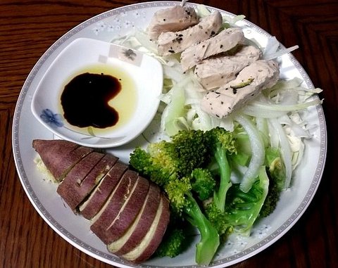 <운동 전 저녁- 고구마(중간크기1), 닭가슴살 한쪽, 브로콜리+생야채, 발사믹소스>