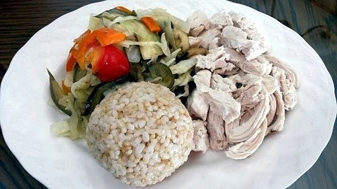 <아침- 현미밥100g, 닭가슴살 한쪽, 가지야채볶음>
