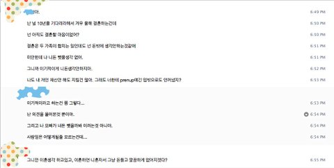 결혼을 하면 남도 아니고 부부가 되는건데 어떻게 결혼하기도 전에 이혼할 생각을 하느냐..정말 이기적이다, 날 니돈 뺏고싶은 남자로만 보이냐.. 10년동안 널 기다려준 난 뭐가돼냐 등등