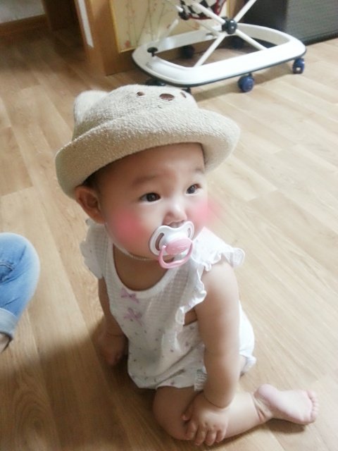 레임이의 친구가 놓고 간 모자를 씌워봤어요~ 알고보니 이 모자 아가들이 꽤나 쓰고 다니더라구요? 폰으로 볼터치 좀 해 주었죠^^;