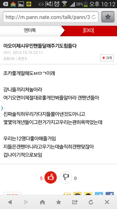 시우민 욕할때 없었던 팬들도 어떡해든 해보겠다고 설득하는데 말 그렇게 하고 그러면 좋아? 거기 있는 모든 팬들이 잘못한것도 아니고. 걔네들이 등돌리니깐 좋아? 분란 만들기 싫다는 애들도 있는데 니네가 이러고 있는것 자체가 분란을 만드는거야.