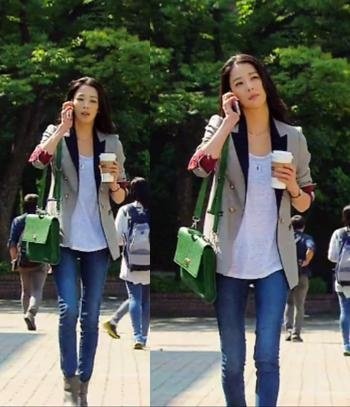 청바지입고 초록색 쿠론숄더백 멘 패션 감각까지 센스작렬!