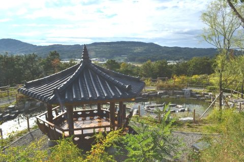 맑은 물이 흐르는 정자와 넓은 잔디 밭이 있어