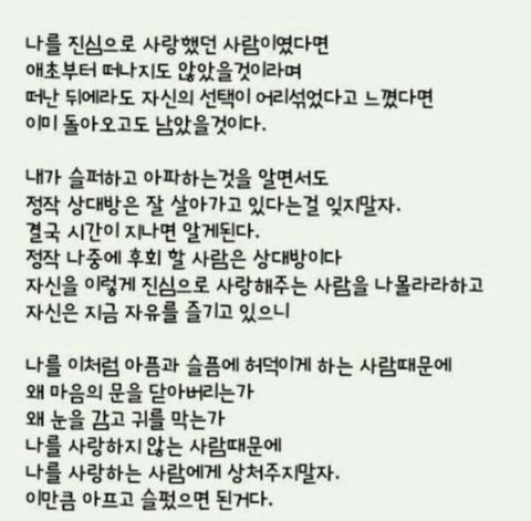 이제 한달 지남 한번도 안잡아준 그사람이 너무나 미웠음 하지만 나는 나를 사랑하지 않는 사람을 놓친거지만 그사람은 자기자신을 사랑해..