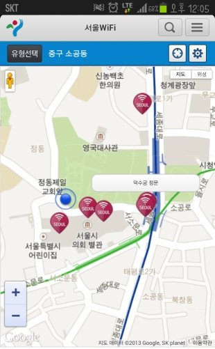 위와같이 모바일서울 접속 후에 와이파이 누르면 내 주변 정보가 담긴 지도가 나옵니다.