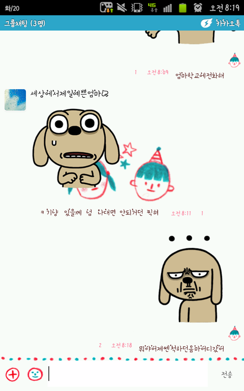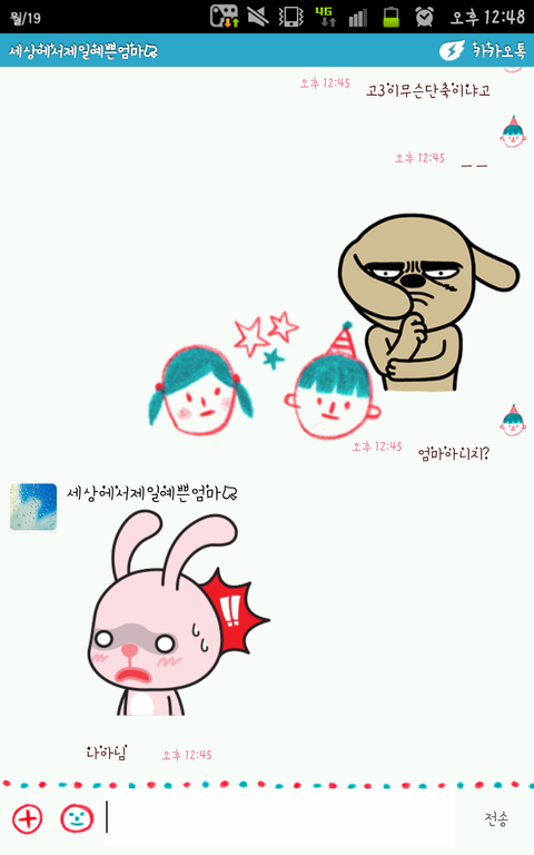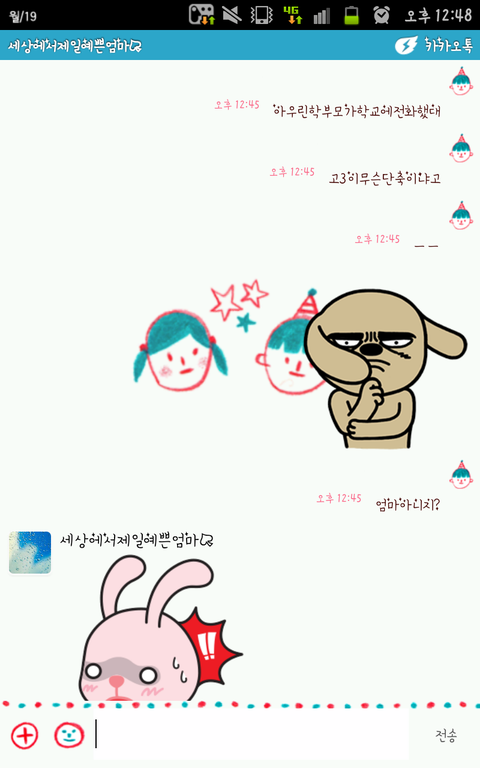 그리고 저때 우리 엄마 스마트폰 초보자 여서 카톡 보내는 것 밖에 몰랐음.근데 저 이모티콘은 어떻게 받았는지ㅠㅠ넘 귀여웠음ㅋㅋㅋㅋㅋㅋㅋㅋㅋㅋㅋㅋㅋㅋㅋㅋ지금은 이모티콘 업데이트 될때마다 전부 다~~~~~~~~~~~~받으심ㅎ.ㅎ