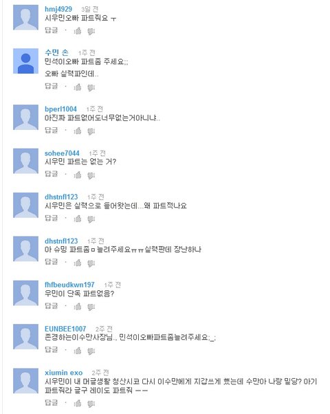 뭐?ㅋㅋ 파트쏠림 현상 ㅋㅋ아놔웃겨 ㅋㅋ왜 안시키녜노래 못부르니까 안시킨다고 저정도 실력으로 가수 무대가 무슨 장기자랑도 아니고 한소절 중간음 정도나 시키겠지 라이브때 실력 뽀록나고 엑소 무대 망칠일 있냐 ㅋㅋ망신당하고 싶어?