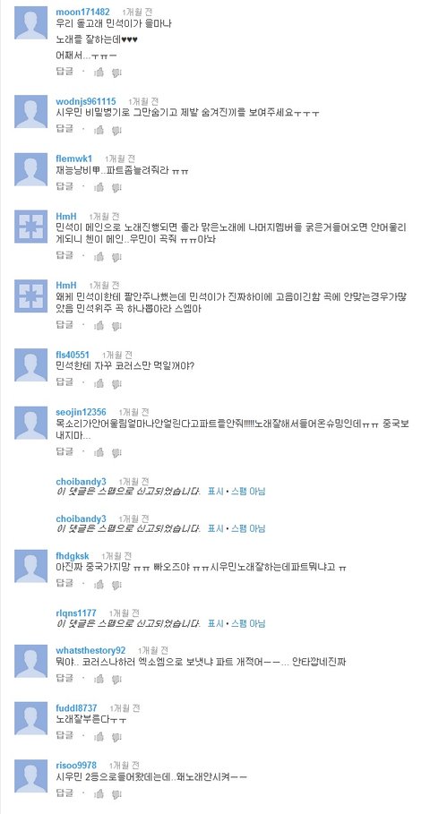 구하라 현아 소시 윤아 노래시켜줘여 왜 파트 없어여차별 너무 심해차라리 이글이 이해가 갈정도볼때마다 민망해죽겠어 ㅋㅋㅋㅋ제발 이런 글 달지 않게 유튜브에서 이런 창피한 짓좀 하지말아라지극히 객관적으로 노래실력은첸-디오-백현-(수호,루한)-(찬열,크리스)-레이,타오,(시우민,카이),세훈이다인정할껀 인정해라 박순희들아http://www.youtube.com/watch?v=yxTqyNLtaMYhttp://www.youtube.com/watch?v=4L4aJnkTj04찬열이나 크리스는 랩이라도 잘하지 가수로써 랩이라도 잘하든가마마 랩진짜 개코미디 아무 이유없이 뒤에서 춤추고 파트 적은거 아니란다