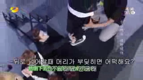 수호가 겁이많다고 지목되서 겁없다고 증명하라고 멤버들이아래에서 받치고 수호가 넘어가기로함