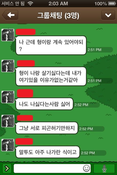 "그럼 나는 OO 때문에 내 인생 망치는거네요? 결국 OO 땜에 한국 들어가는 거나 다름 없는건데.. 집에 돈도 없는데 왜 유학을 왔는지 후회가 되네요."