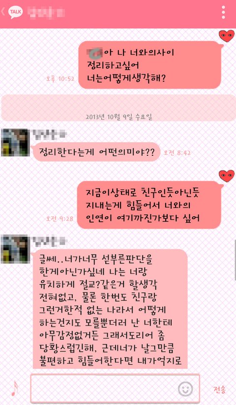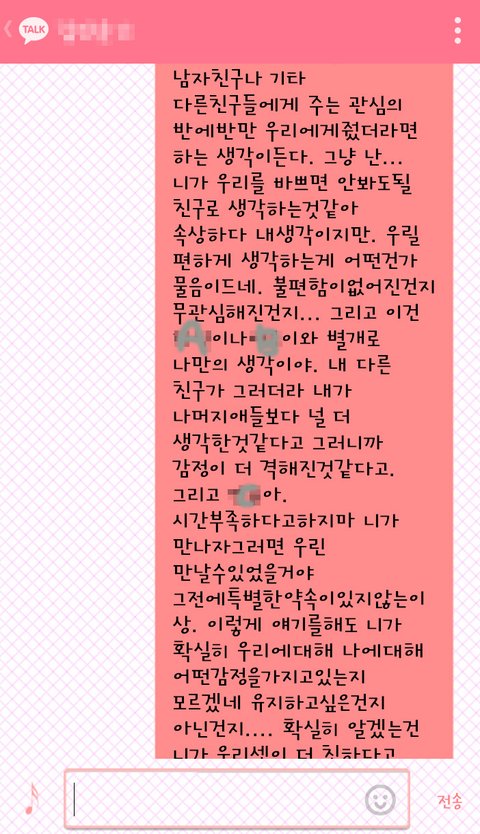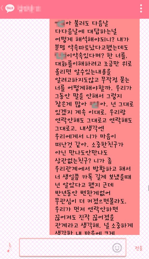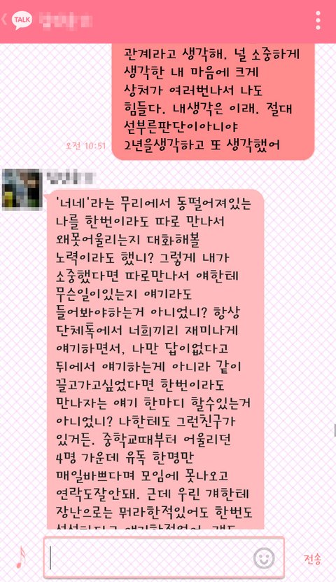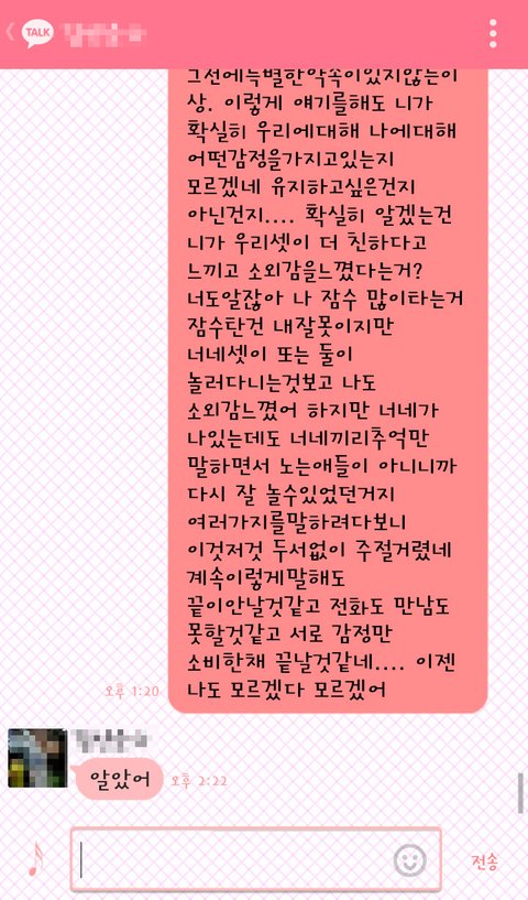 그런상태가 지속되다가 C가 한달전인가? 진~~~~짜 오랜만에 그룹채팅창에서 만나자고 한거예요 C가 먼저!! A가 남자친구가 생겼거든요. A가 남자친구랑 찍은사진으로 카톡사진 바꾸니까 대박! A! 남자친구생겼어? 보자!! 이러면서 일요일날 보자그랬는데, 그날 제가 선약이 있어서 너네 셋이서 보라고 했어요. 사실 선약도 있긴했는데 B랑C에대한 앙금이 안풀려서 안만난것도 있고요. 몇일뒤에 제 약속이 깨져서 그룹창에 얘들아 너네 만나? 이랬더니 A만 대답을 하는거예요. 그냥 흐지부지 됐다고. 그래서 제가 얘들아! 나 약속깨졌다구 만나자고 하니까 B랑C는 또 대답없고.... 한참뒤에 대답하고 그래서 결국은 못만나게 됬어요.