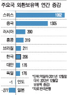 주요국의 경우 지난해 외환보유액 규모가 대체로 늘어난 것으로 나타났다. 지난 한 해 동안 외환보유액이 가장 많이 늘어난 나라는 스위스로 1992억달러가 늘었다. 스위스의 외환보유액 순위는 2011년말 6위에서 지난해말에는 4위로 뛰었다. 이 차장은 "지난해 유럽 위기가 지속되면서 스위스 프랑이 안전자산으로 분류되자 이 스위스로 많이 들어갔다"면서 "이에 따라 스위스 프랑 가치가 절상되자 이를 조절하기 위해 (당국이) 개입하면서 외환보유액이 많이 늘어난 것으로 보인다"고 말했다.