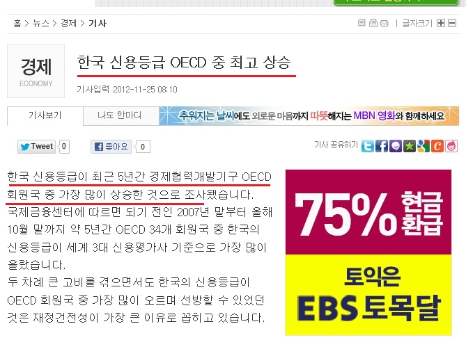 "한국, OECD 국가 중 가장 빠른 회복세 보여" http://news.naver.com/main/read.nhn?mode=LSD&mid=sec&sid1=101&oid=003&aid=0003048881 2010 년 OECD 한국경제보고서 -> http://www.oecd.org/dataoecd/6/11/45441890.pdf 2012 년 OECD 한국경제보고서 -> http://www.oecd.org/d0cument/34/0,3746,en_2649_33733_50202274_1_1_1_1,00.html