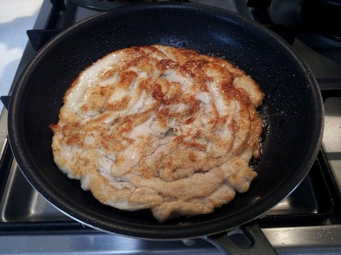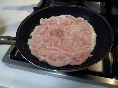 2) 팬에 기름을 먼저 살짝 두르고 닭가슴살을 얇게 펴 올린다음에 불을 켜줍니다.