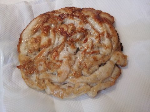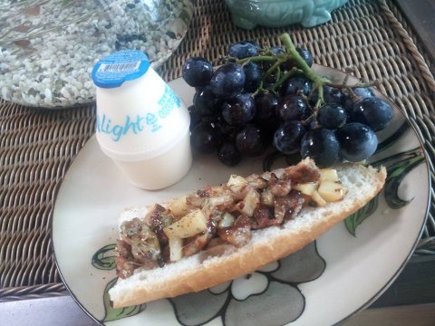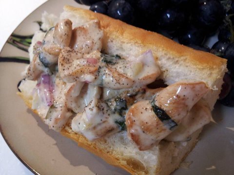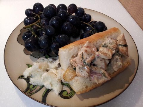 닭가슴살을 썰어서 살짝 꼬아 쪽파로 묶은 다음에 볶아서 위의 마요네즈소스에 버무린건데요, 이거 진짜 맛있어요. 아래 볶은 김치가 깔려있기는 한데 무의미하고요, 닭먼저 집어먹고 바게트 조금씩 뜯어서 저 소스 찍어먹으면 일품!