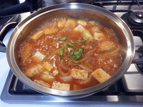 점점 냉장고가 빈약해져갑니다. 두부, 감자, 쭉쭉 찢은 김치 넣고 끓인 찌개입니다.