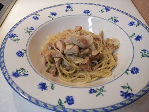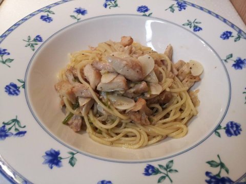 먹다남은 치킨을 양껏 넣은 올리브오일 파스타