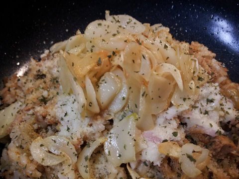 팬에 참치+설탕 약간+고춧가루+간장 약간+물이나 맛술 넣고 조리신다음에 뜨거운 밥이랑 섞는거예요.