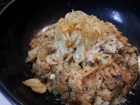 김치볶음밥엔 참치에 치즈가루랑 마요네즈소스 살짝 얹고 마늘칩만 듬뿍 얹은거고요,