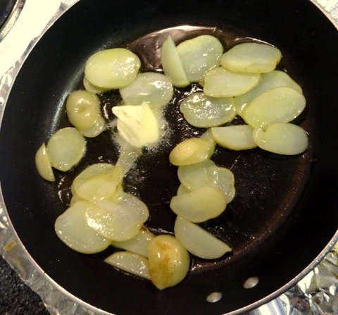 오일 두르고 감자 얇게 깐 뒤 풍미를 위해 소량의 버터 투입