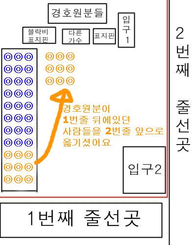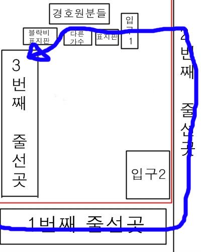그렇게 5분정도 더 앉아있으니까 경호원분이 다시오셔서 1번줄이 너무 길다고