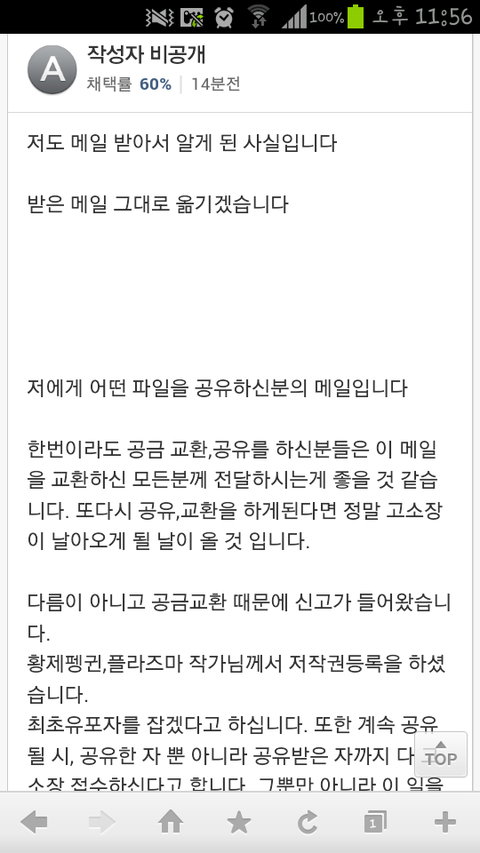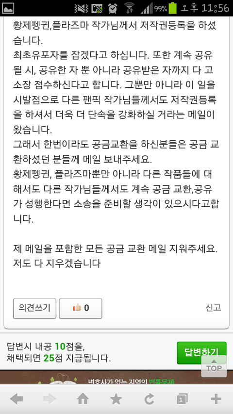 다름이 아니고 공금교환 때문에 신고가 들어왔습니 다. 황제펭귄,플라즈마 작가님께서 저작권등록을 하셨 습니다. 최초유포자를 잡겠다고 하십니다. 또한 계속 공유 될 시, 공유한 자 뿐 아니라 공유받은 자까지 다 고 소장 접수하신다고 합니다. 그뿐만 아니라 이 일을 시발점으로 다른 팬픽 작가님들께서도 저작권등록 을 하셔서 더욱 더 단속을 강화하실 거라는 메일이 왔습니다. 그래서 한번이라도 공금교환을 하신분들은 공금 교 환하셨던 분들께 메일 보내주세요. 황제펭귄, 플라즈마뿐만 아니라 다른 작품들에 대 해서도 다른 작가님들께서도 계속 공금 교환,공유 가 성행한다면 소송을 준비할 생각이 있으시다고합 니다.