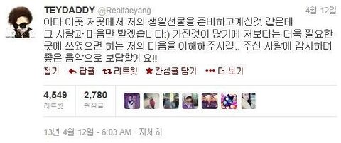 태양은 지난 12일 자신의 트위터에 “아마 이곳저곳에서 저의 생일선물을 준비하고 계신 것 같은데 그 사랑과 마음만 받겠습니다”라는 글을 남겼다.