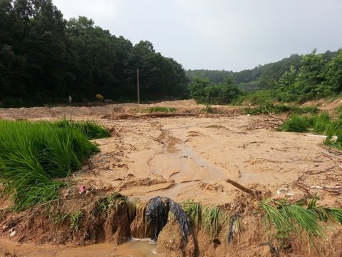 폭우로 인한 산사태로 인근 인삼밭까지 토사가 밀려 내려와 배수구를 덮어 중장비지원이